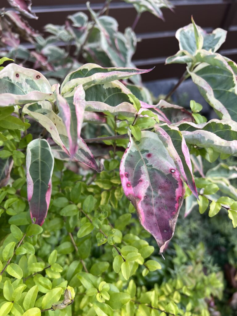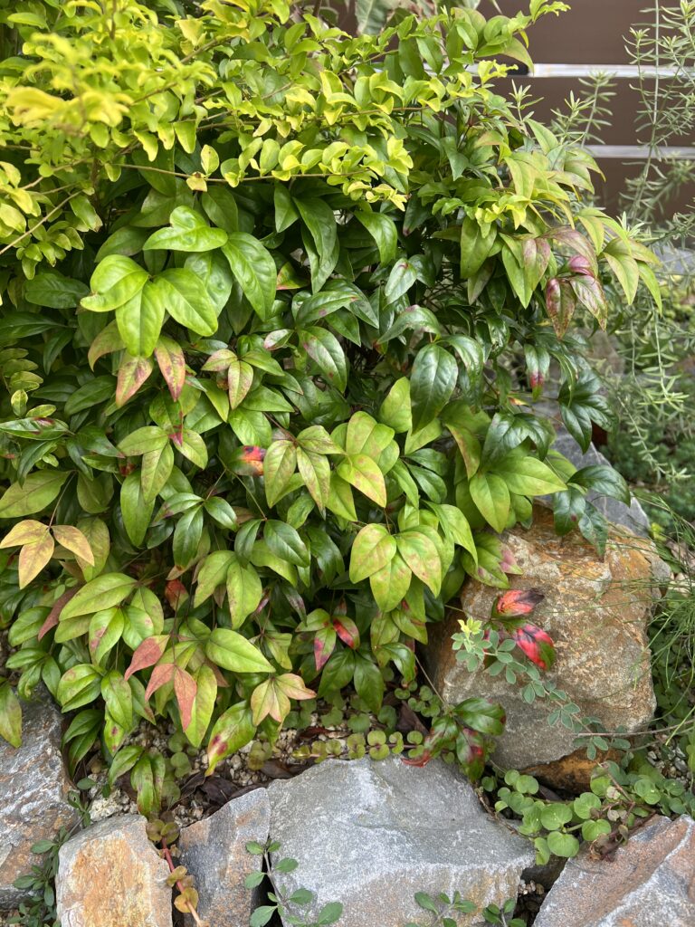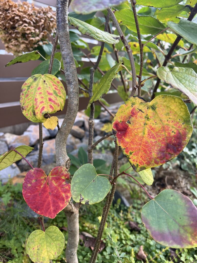 丸みを帯びたハート形の葉が赤くなり始めました。