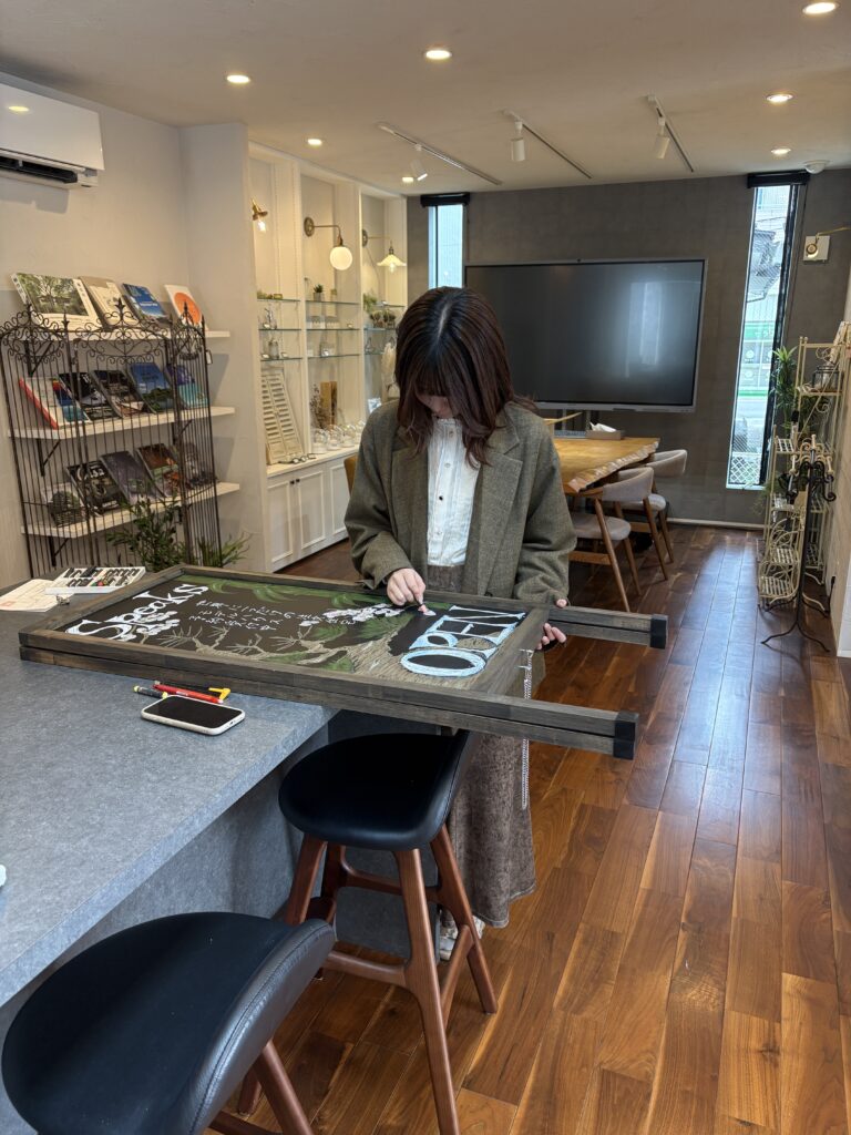 絵がとっても上手な大内が、会社のロゴにもなっている松竹梅をデザインした看板を書いてくれました!