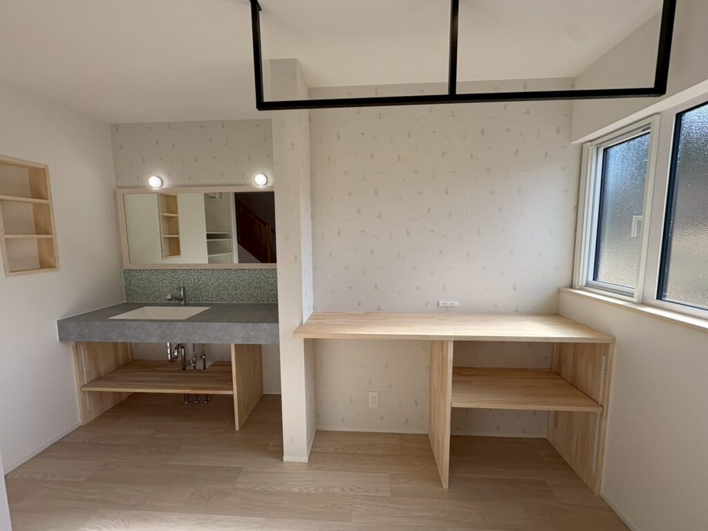 そして広々とした洗面ランドリールームもアクセントクロスで柔らかい印象の仕上がりになりました。