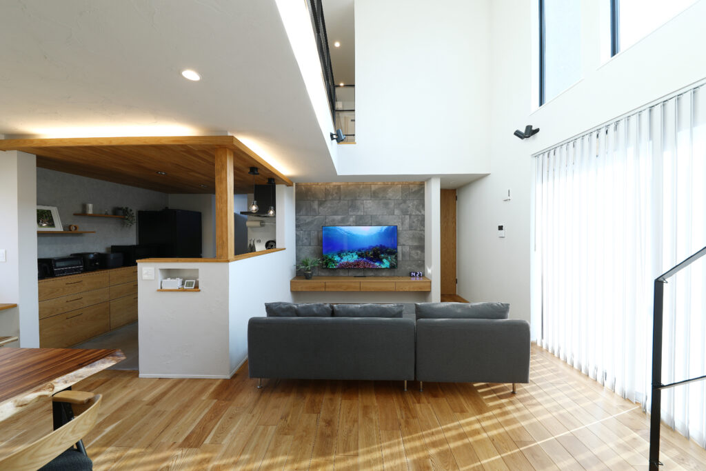 吹抜けと大開口サッシが生み出す圧倒的な明るさ。天井高を活かしたゆとりある設計により、存在感のある家具や大きな観葉植物、アートやポスターといったボリュームのあるインテリアも自然に調和します。