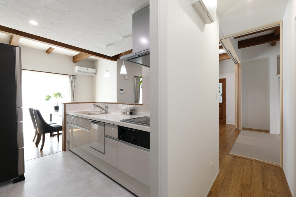 あえて“見せない”ための工夫です。生活感が出やすいキッチンまわりを程よく隠せるため、突然の来客時にも安心。さらに、水はねや油はねがダイニング側へ広がるのも防いでくれます。完全なオープンキッチンにするのではなく、適度に視線をコントロールすることで、落ち着いて料理に集中できます。