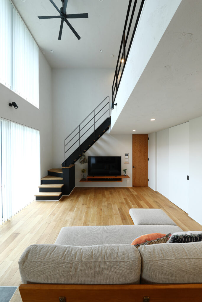 吹抜けと大開口サッシが生み出す圧倒的な明るさ。2階までまっすぐに伸びる視線の抜けも、この住まいの大きな魅力です。