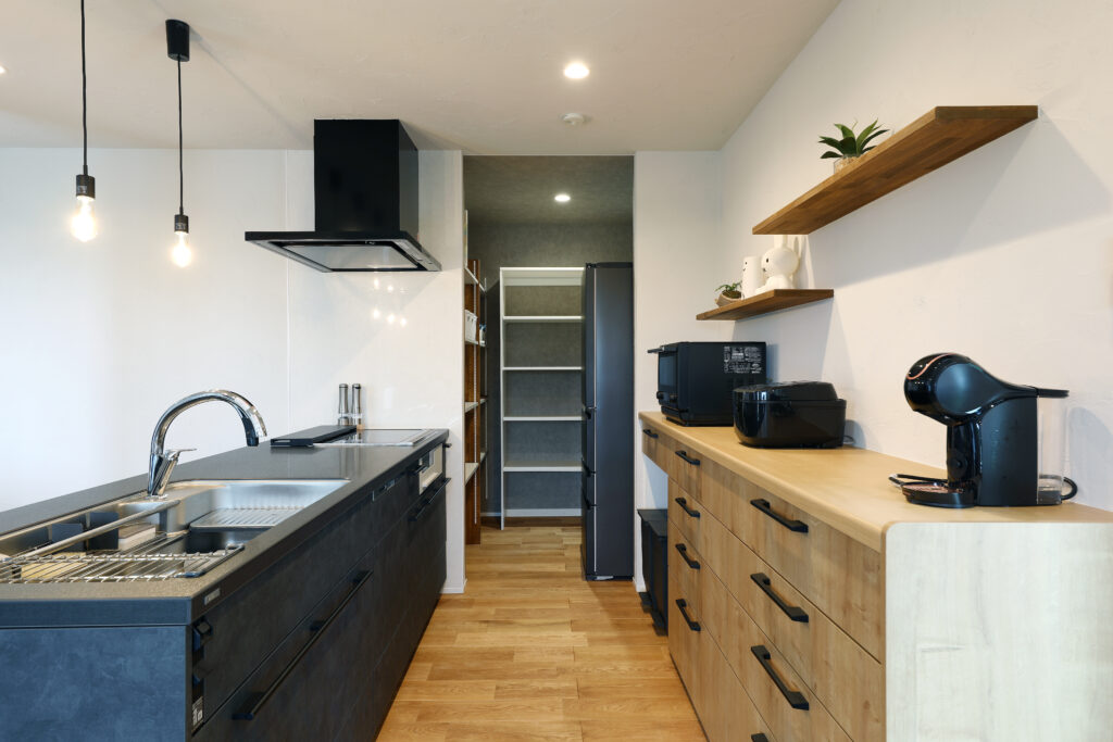 広々としたキッチンのすぐ隣には、1.5帖のパントリーが備わっています。食材や調味料、買い置きのストックをすぐに取り出せるため、調理の流れがぐっとスムーズに。作業台や棚にモノがあふれにくく、キッチン全体が自然とすっきり整います。まとめ買いをしても収納に困らず、非常食や日用品もひとまとめに。普段使わないキッチン家電や、生活感の出やすい道具をしまっておけるのも嬉しいポイントです。必要なものを必要な時にすぐ取り出せる近さが、家事の負担をやさしく軽くしてくれる、暮らしに寄り添う便利なスペースです。