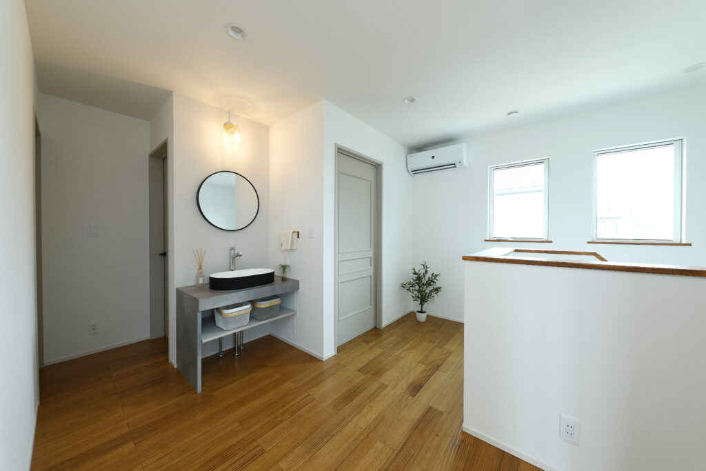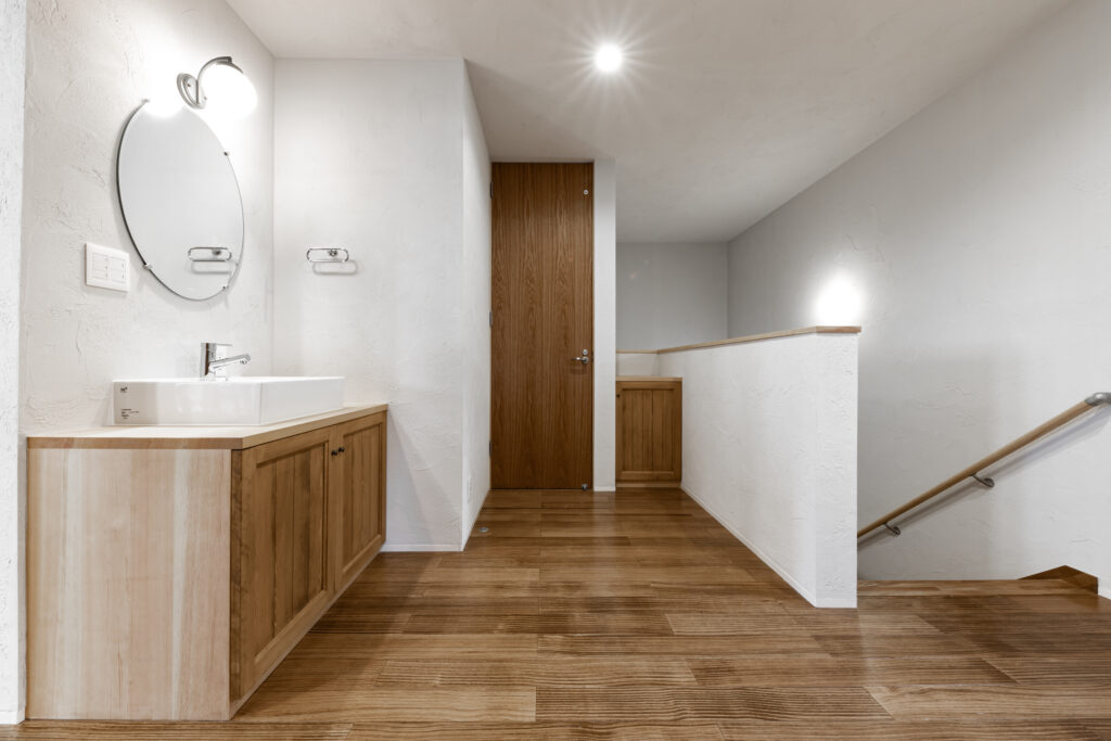 2階のホールにも洗面台があることで、朝の身支度が重なる時間にも少し余裕が生まれます。寝室に近いので、寝る前の歯磨きやスキンケアもラクに行えるのが嬉しいポイントです。家族が休んでいる時間でも気兼ねなく使え、ちょっと汚れた手を洗いたいときにもサッと対応できる便利さが魅力です。来客の際も生活感のある洗面台を見せずに済むため、いつでも気持ちよくお迎えできます。家全体にゆとりが生まれ、毎日の小さな‘‘手間’’や‘‘順番待ち’’を自然と解消してくれる、暮らしに寄り添う便利で上質な設備です。
