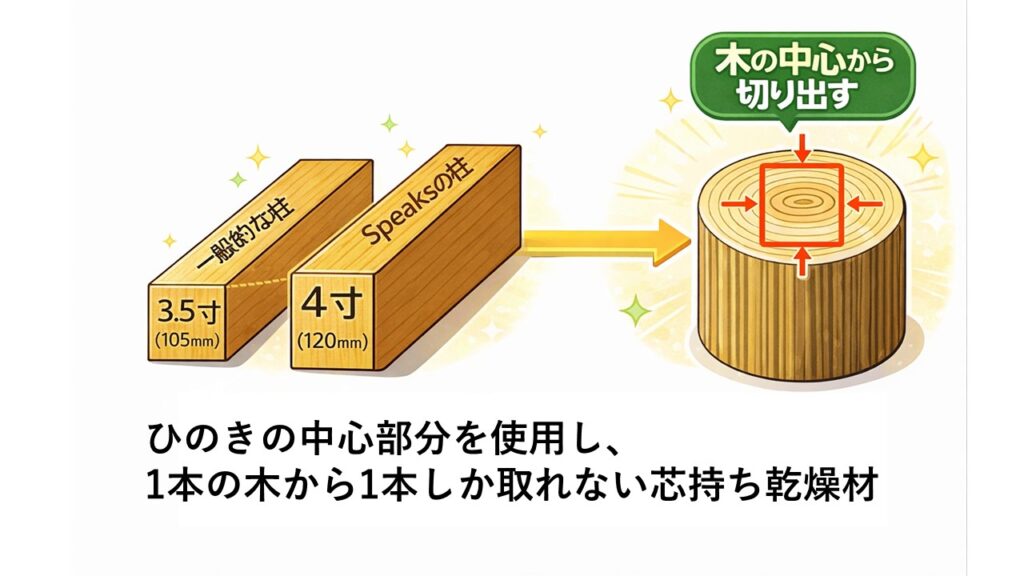 国産の無垢ひのき4寸角(120mm角)は、一般的な3.5寸(105mm)より太く、家をしっかり支える強い構造です。芯持ち乾燥材は、建てた後の反りや縮みが起きにくく、ひび割れや建具のズレを防ぎやすいのが特長です。