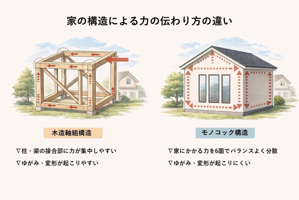 構造は、柱の強さに加え、壁や床を面で固めるハイブリットモノコック構造。